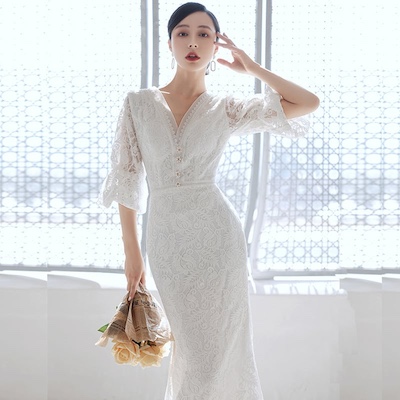 クラシカルな総レースデザインが上品。カジュアルな会場にも映える洗練されたシルエットが魅力です。