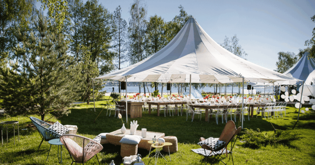 白いテントやランタンを使った空間演出が定番。ソファやラグ、木製家具などを配し、リラックス感と非日常感を融合させたコーディネートが人気です。自然の中でラグジュアリーなひとときを演出できる点が、多くのカップルに支持されています。