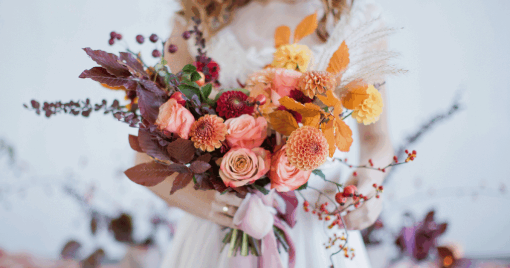 秋らしいアースカラーやドライフラワー、くすみカラーを使ったブーケが人気です。